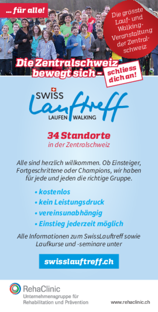 Der SwissLauftreff mit seinen 34 Standorten in der Zentralschweiz ist nach dem 4-Säulen-Prinzip aufgebaut. Er ist kostenlos, vereinsunabhängig, für alle offen und ohne Leistungsdruck. Alle sind herzlich willkommen. Ob Einsteiger, Fortgeschrittene oder Champions, wir haben für jede und jeden die richtige Gruppe. Alle weiteren Details finden Sie auf der Webseite: